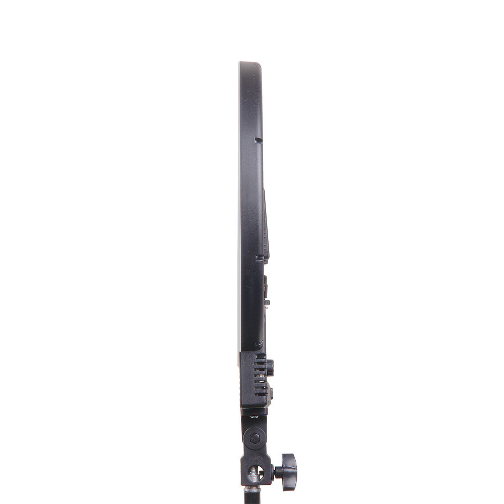 Кронштейн позволяет закрепить прибор на стойке, штанге или другой опорной системе с посадочным диаметром 5/8” и отрегулировать его наклон в пределах 180°, чтобы осветить объект под нужным углом. В комплект также входит кронштейн для установки осветителя в башмак штативного адаптера или камеры. Паз в верхней части корпуса дает возможность повесить панель на стенку или другую вертикальную поверхность.